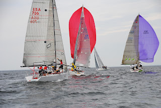 After the downwind leg the germans are in a comfaortable lead. The early jib really payed off for them. Both american boats came closer as well.